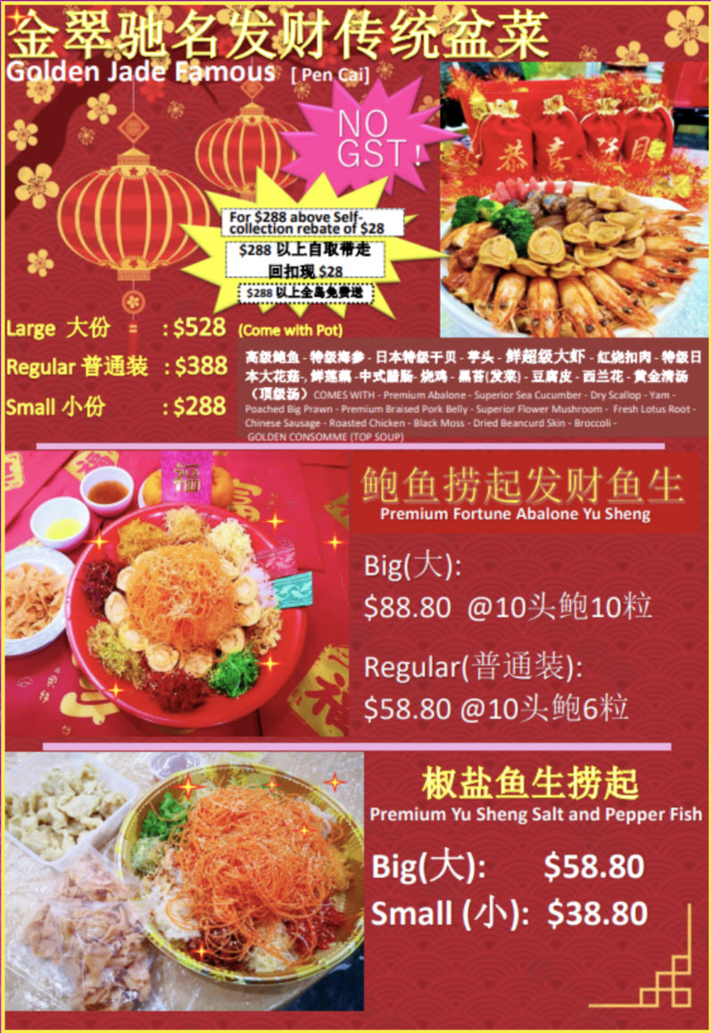 Pre-order your Chinese New Year reunion dinner with Golden Jade today! Orders above $288 will include free shipping!